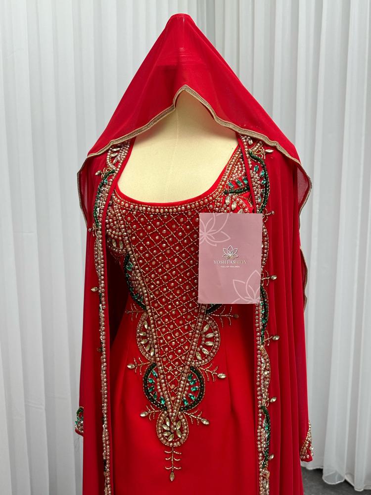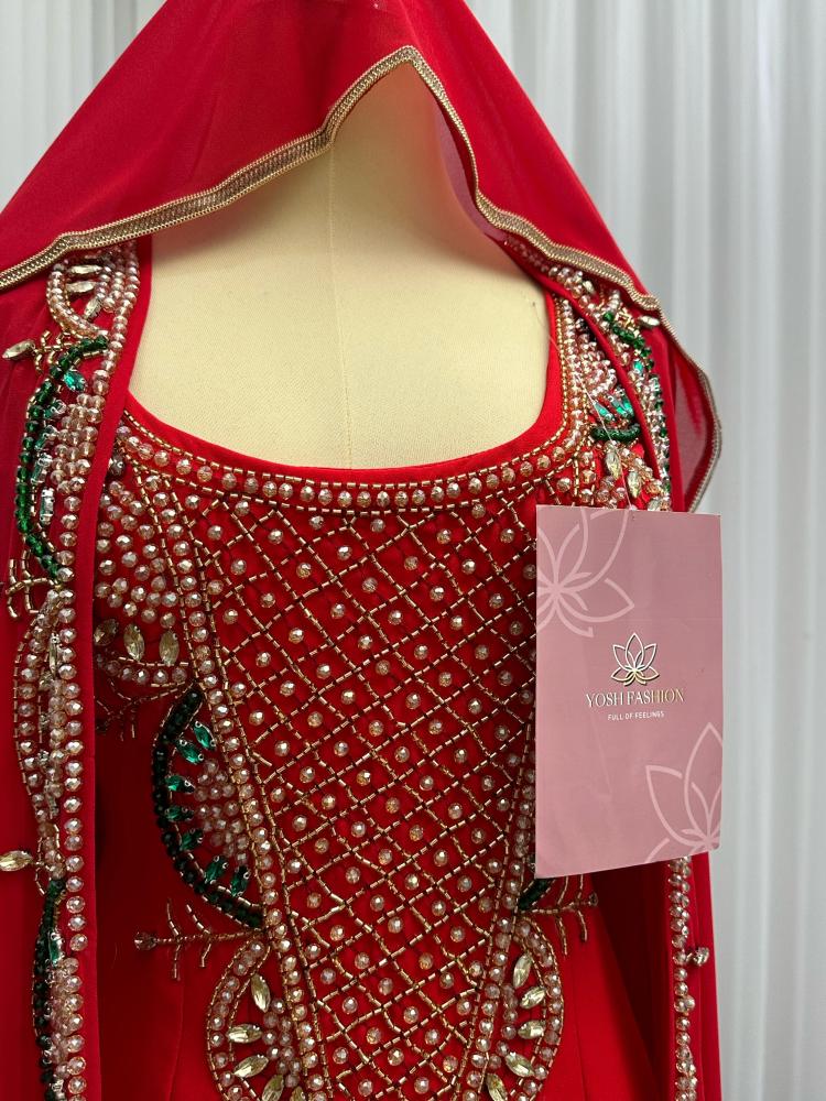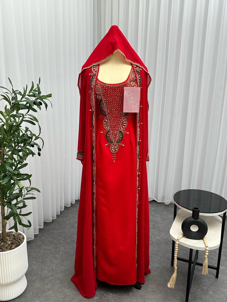 الجلابية تتميز بتصميم انيق و فاخر, الجلابية احمر اللون ، مزينة ب تطريز يدوي كامل التطريز يتوزع على الجلابية كامله مما يضيف عليها لمسه فاخرة و مميزة