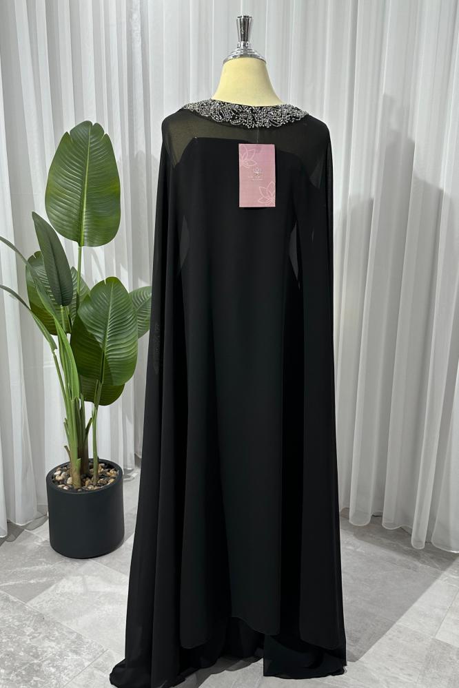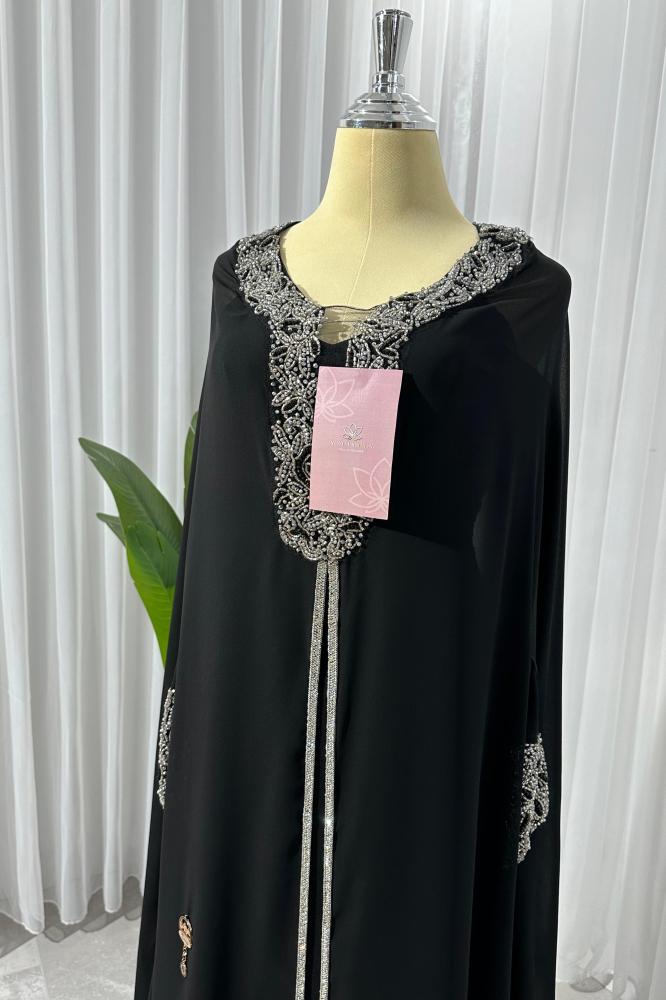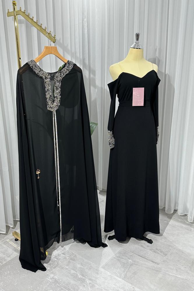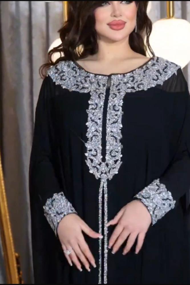 الجلابية و الفستان تتميز بتصميم انيق و فاخر, الجلابية اسود اللون و تتكون من قطعتين و أكمام طويله مطرزة ، مزينة ب تطريز يدوي كامل التطريز يتوزع على الجلابية كامله مما يضيف عليها لمسه فاخرة و مميزة