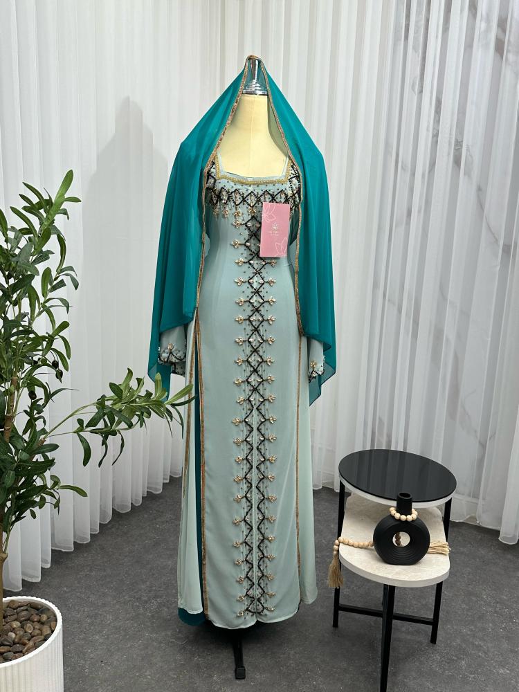 الجلابية تتميز بتصميم انيق و فاخر, الجلابية ازرق فاتح اللون ، مزينة ب تطريز يدوي كامل التطريز يتوزع على الجلابية كامله مما يضيف عليها لمسه فاخرة و مميزة