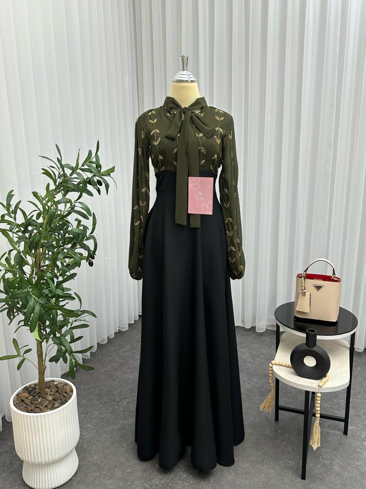 فستان اسود زيتي يتميز ب خصره و تطريزة اليدوي و لونه الجميل