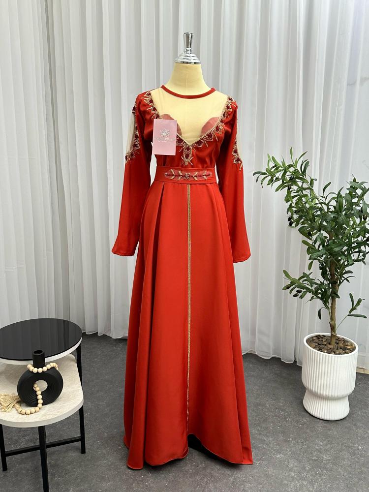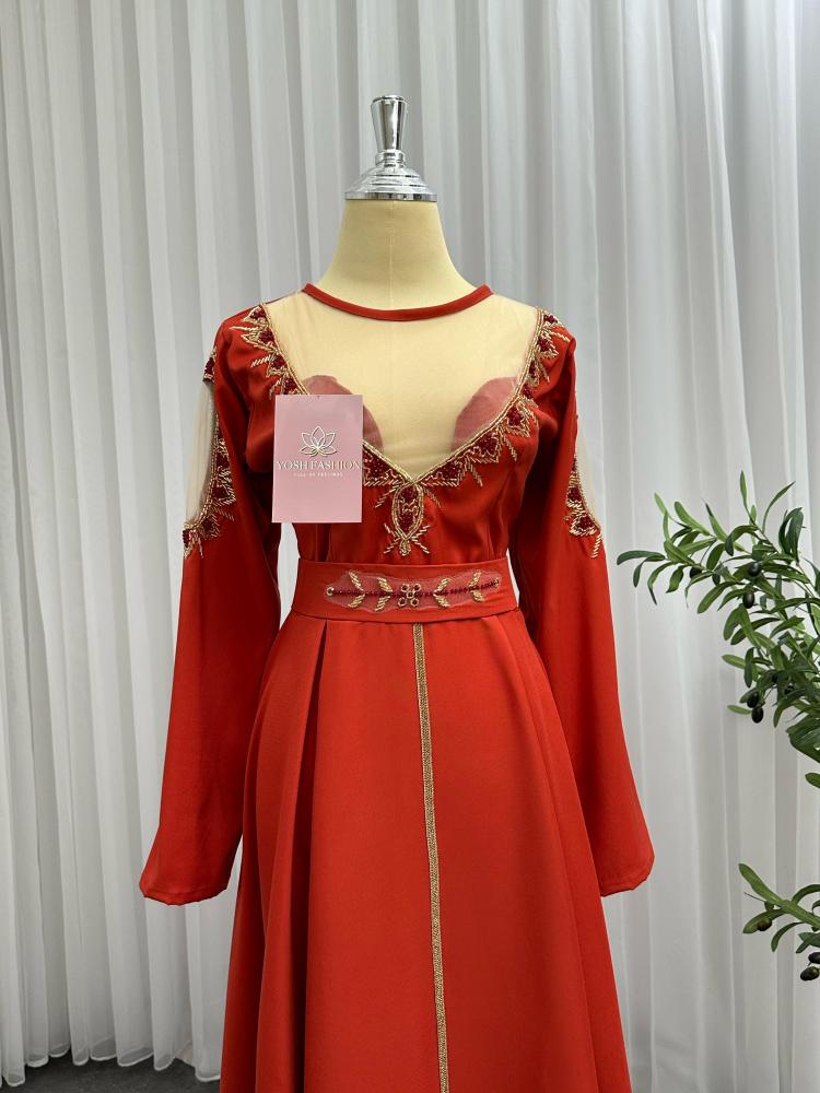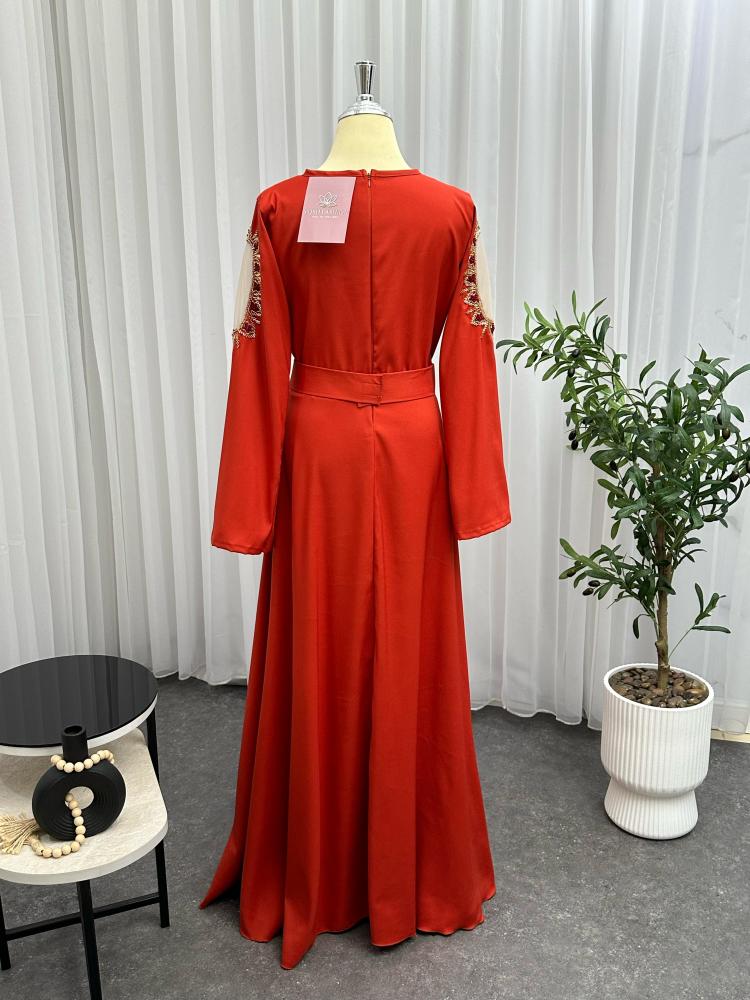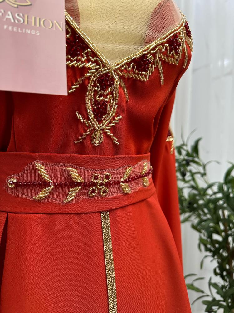 فستان برتقالي مطرز بالصدر يتميز ب خصره الانيق و اكمامه و لونه الاورنجي الجميل