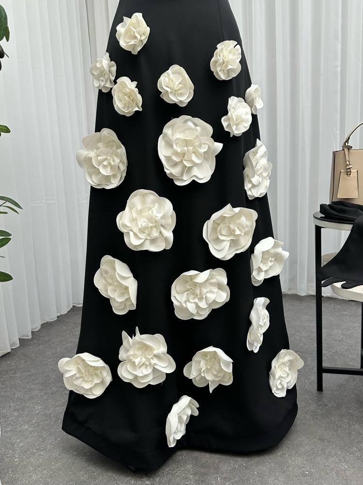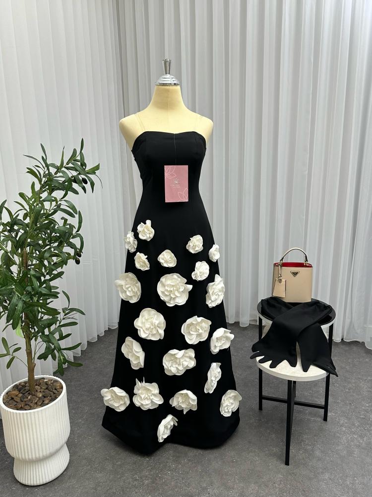 فستان اسود يتميز ب خصره وورد يدوي و اكمامه و لونه الجميل