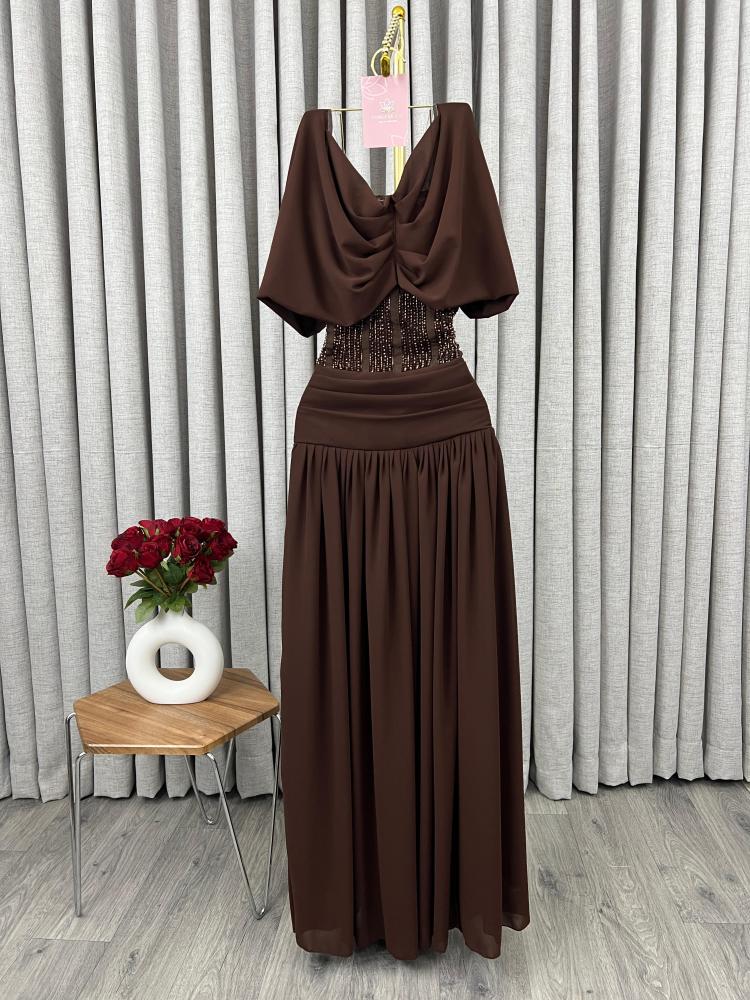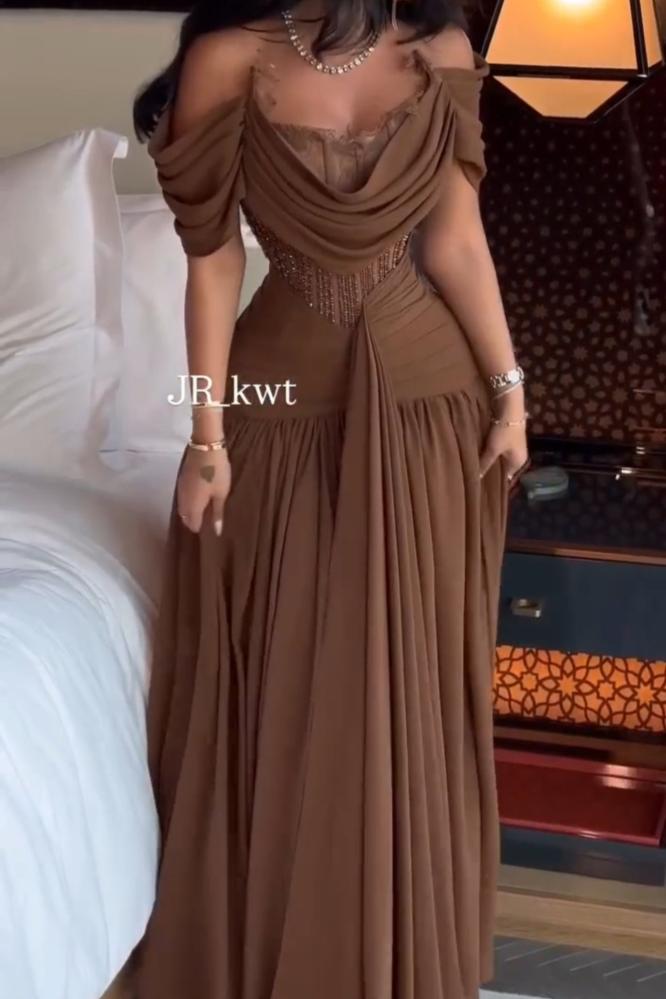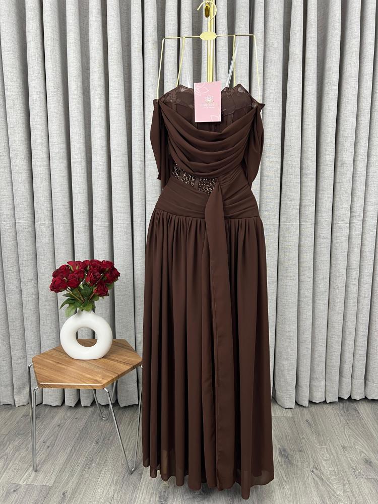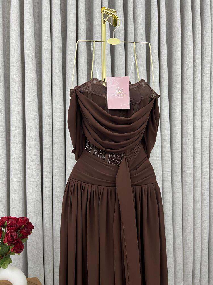 فستان بني أنيق بتصميم أوف شولدر وطيات ناعمة مع حزام مطرز، يمنح إطلالة راقية للمناسبات.✨🌸