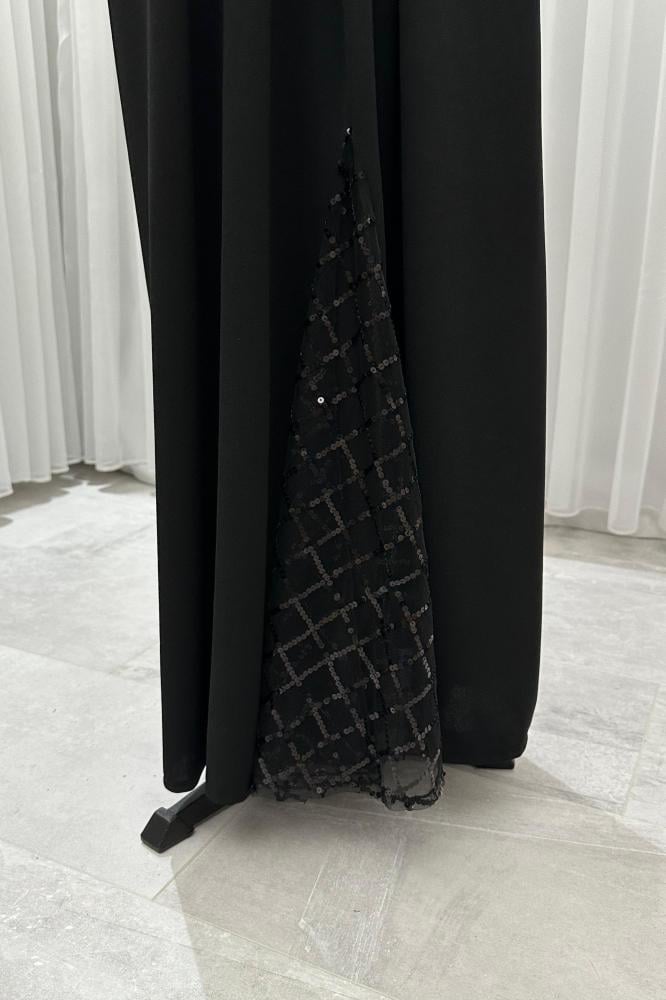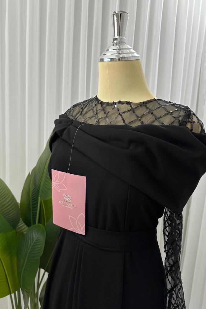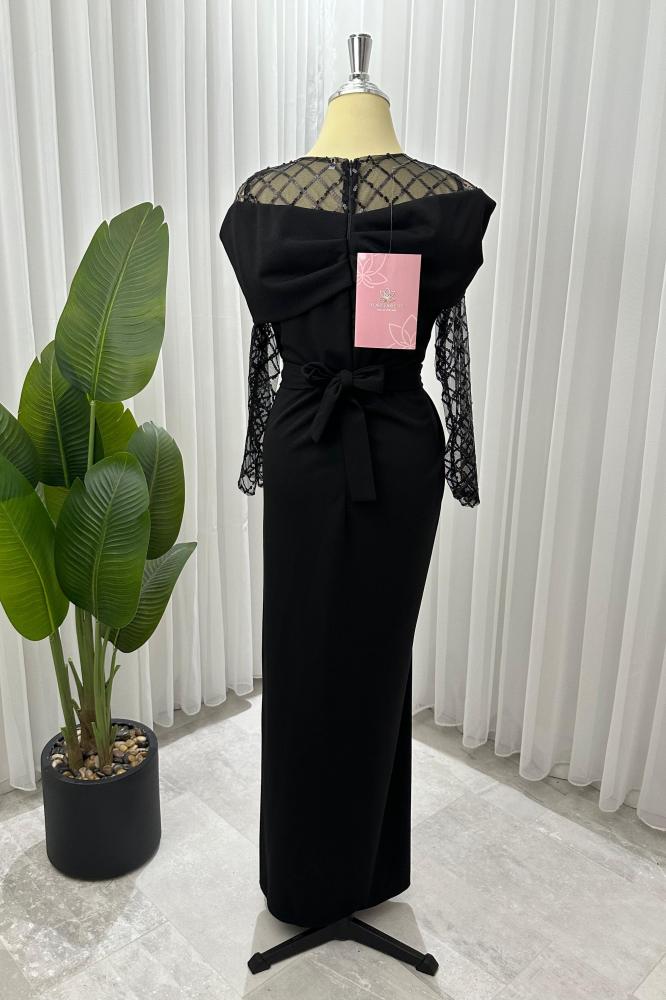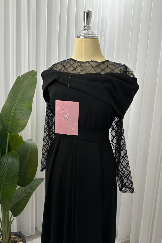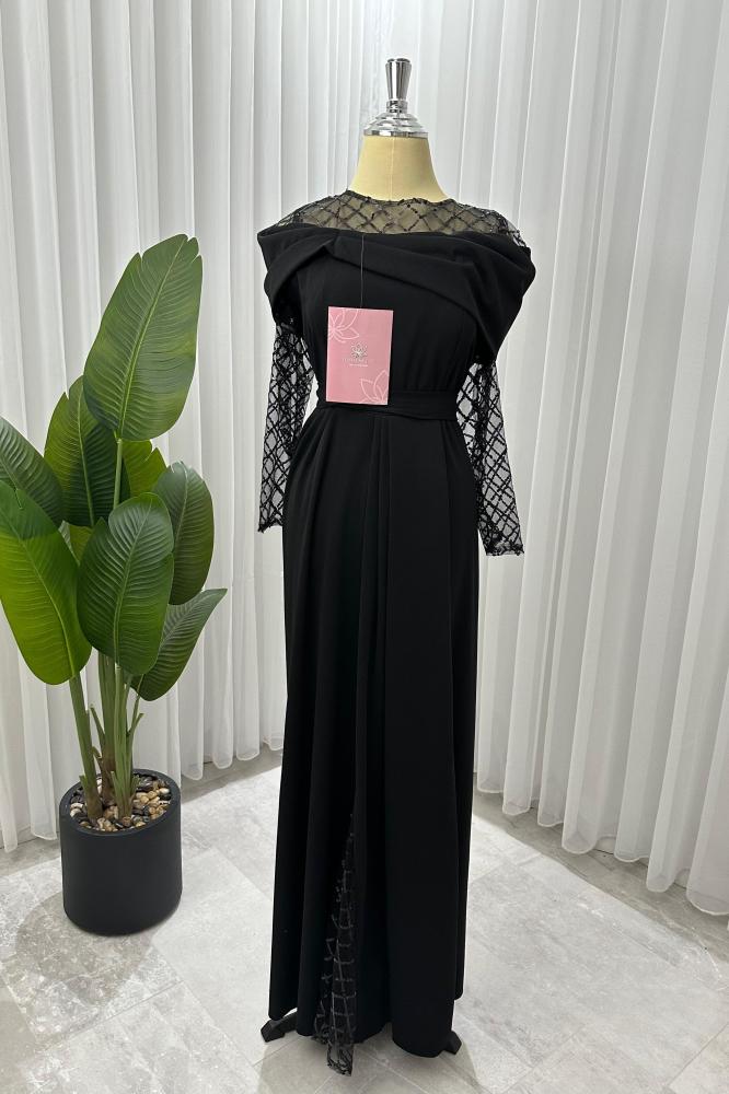 فستان اسود يتميز ب خصره الانيق و اكمامه و لونه الاسود الجميل