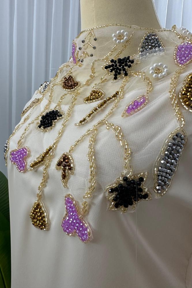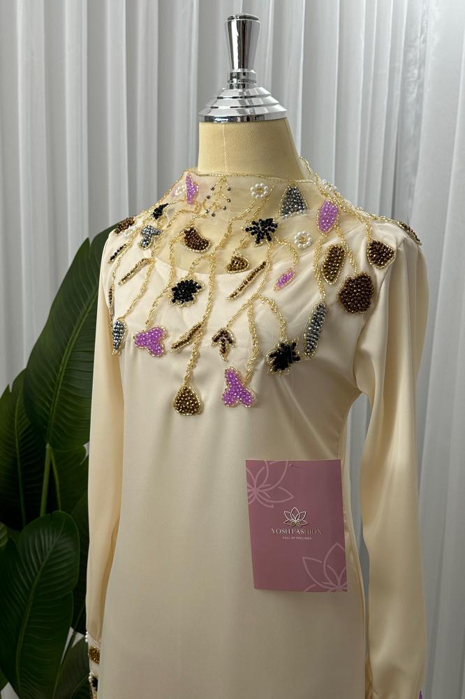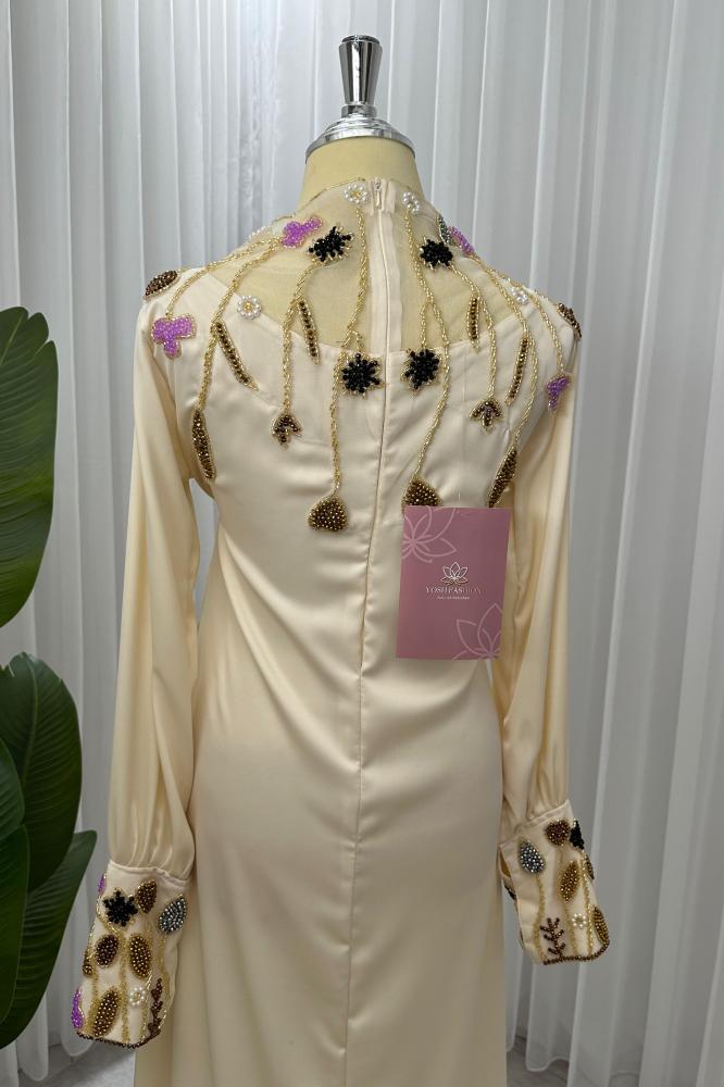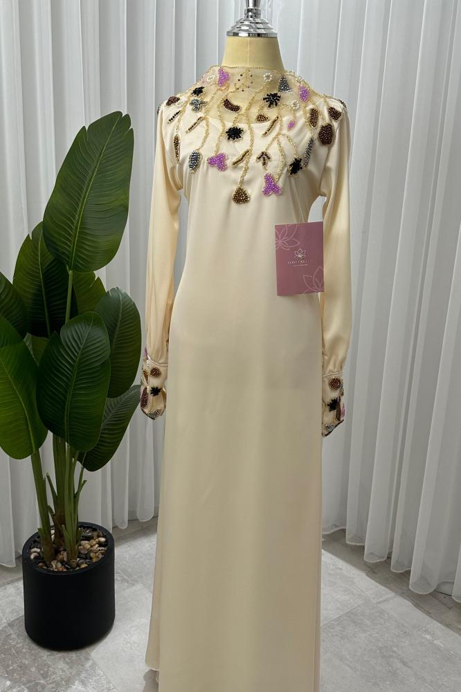 فستان سكري مطرز بالصدر يتميز ب خصره الانيق و اكمامه و لونه السكري الجميل