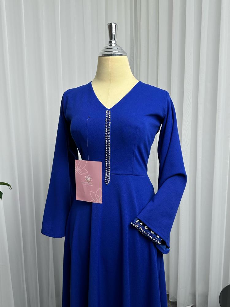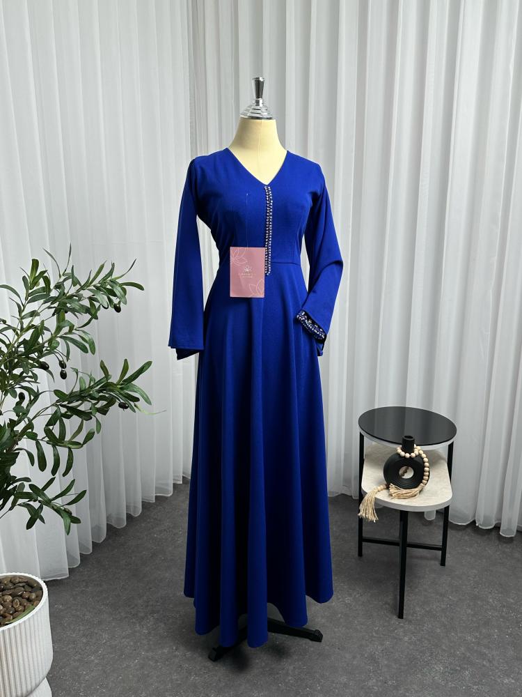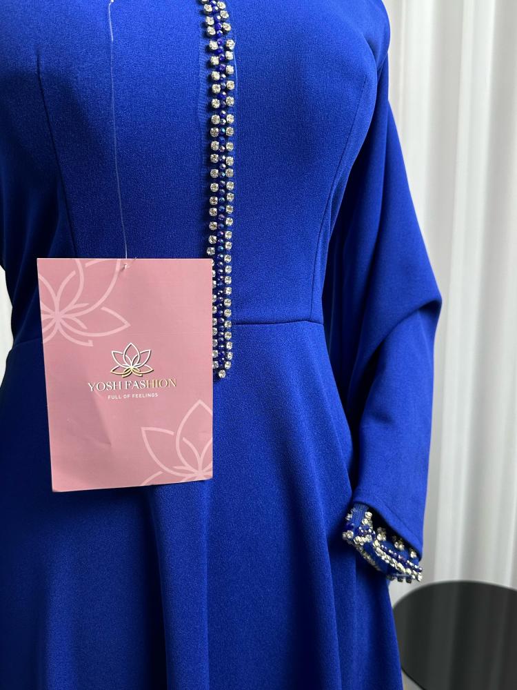 الجلابية تتميز بتصميم انيق و فاخر, الجلابية نيلي اللون و تتكون من أكمام طويله مطرزة ، مزينة ب تطريز يدوي كامل التطريز يتوزع على الجلابية كامله مما يضيف عليها لمسه فاخرة و مميزة