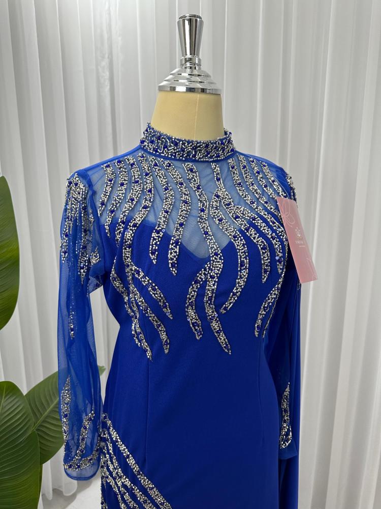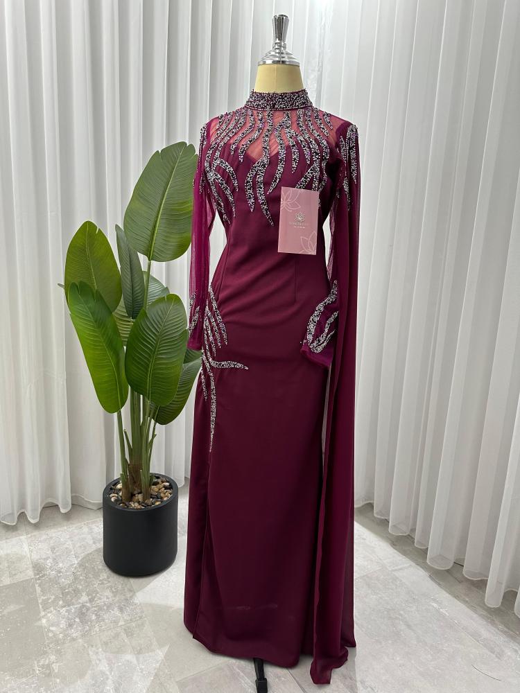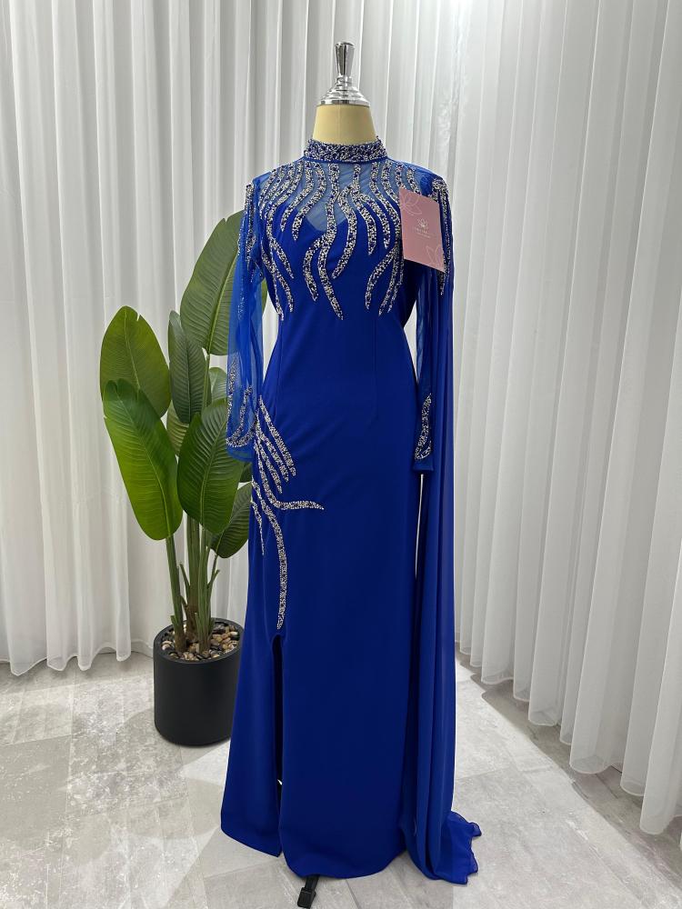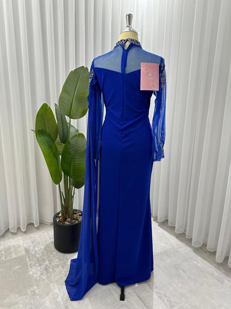 الفستان يتميز بتصميم انيق و فاخر, الفستان ( ازرق و موف ) اللون و تتكون من قطعه واحده ، مزينة ب تطريز يتوزع على اليد و و الفستان كامل مما يضيف عليه لمسه فاخرة و مميزة