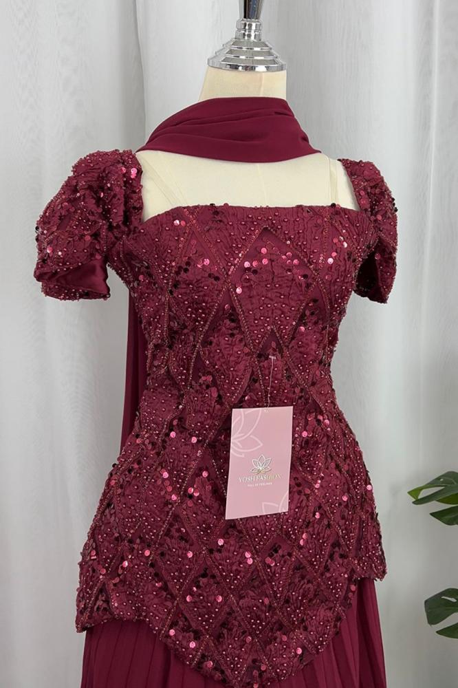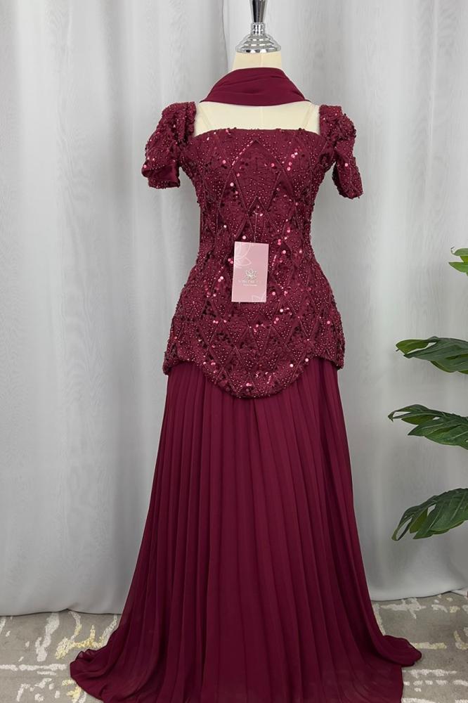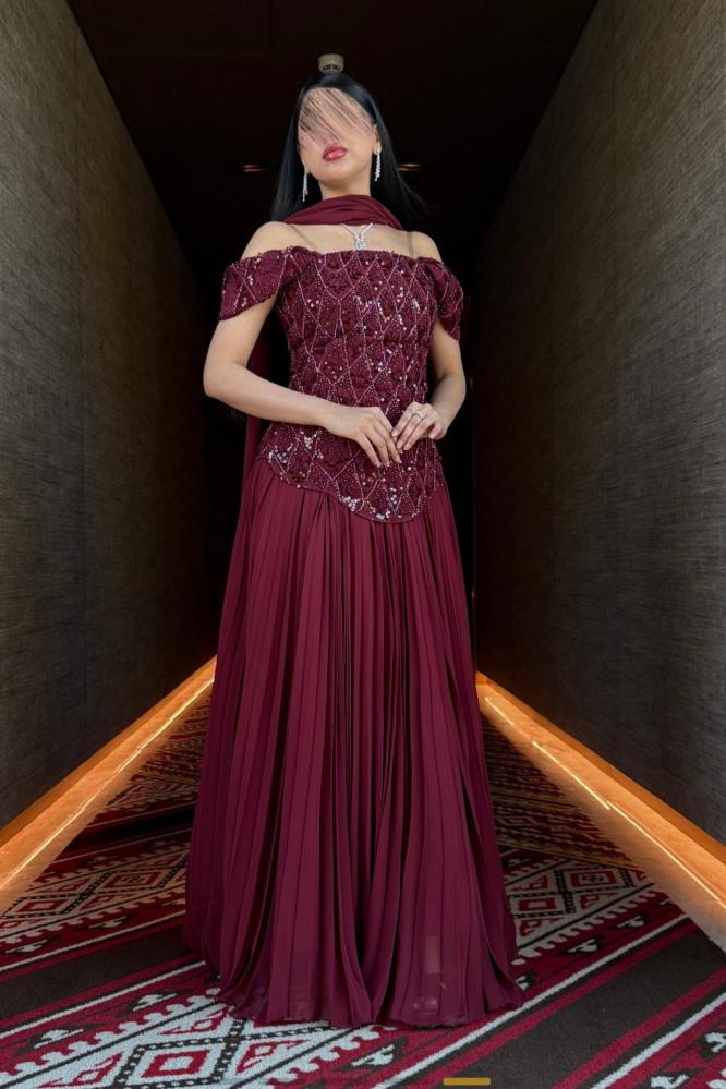 فستان سهرة أنيق بلون خمري، يتميز بتوب مطرز بالخرز والترتر بلمعة فاخرة مع أكمام قصيرة متدلية، وتنورة طويلة بليسيه انسيابية تضيف لمسة راقية مناسبة للمناسبات والحفلات.