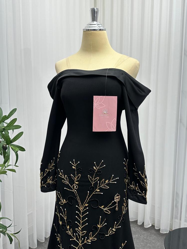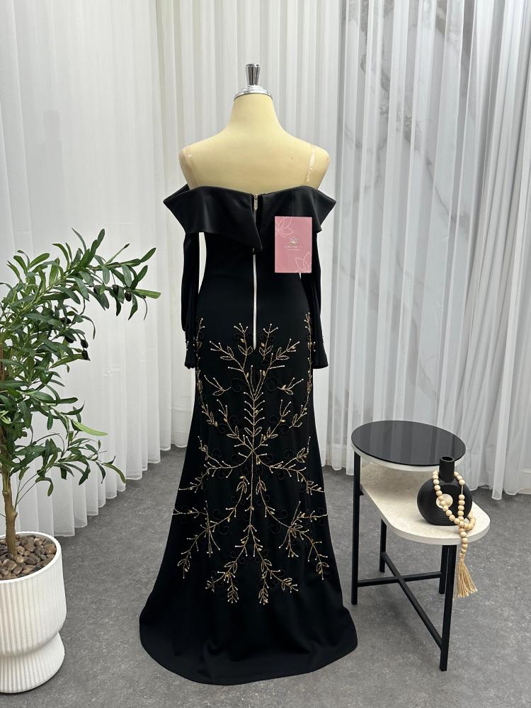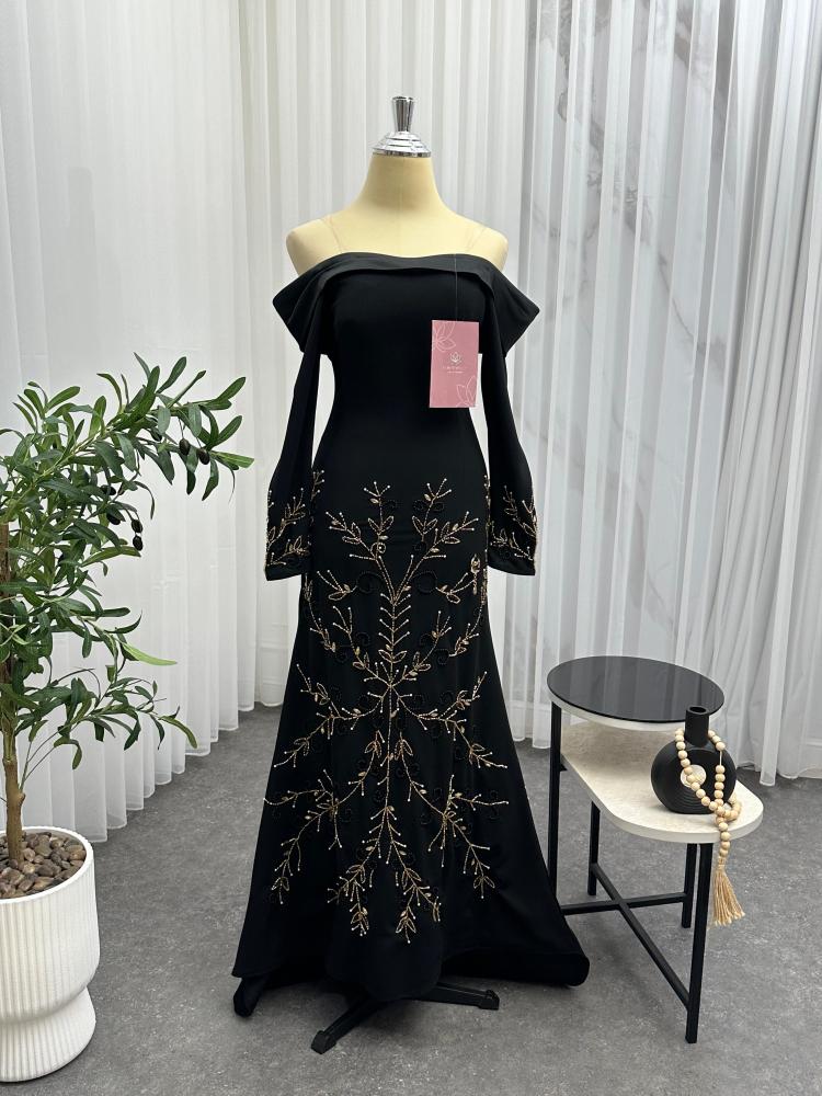 فستان اسود يتميز ب خصره تطريز يدوي و اكمامه و لونه الجميل