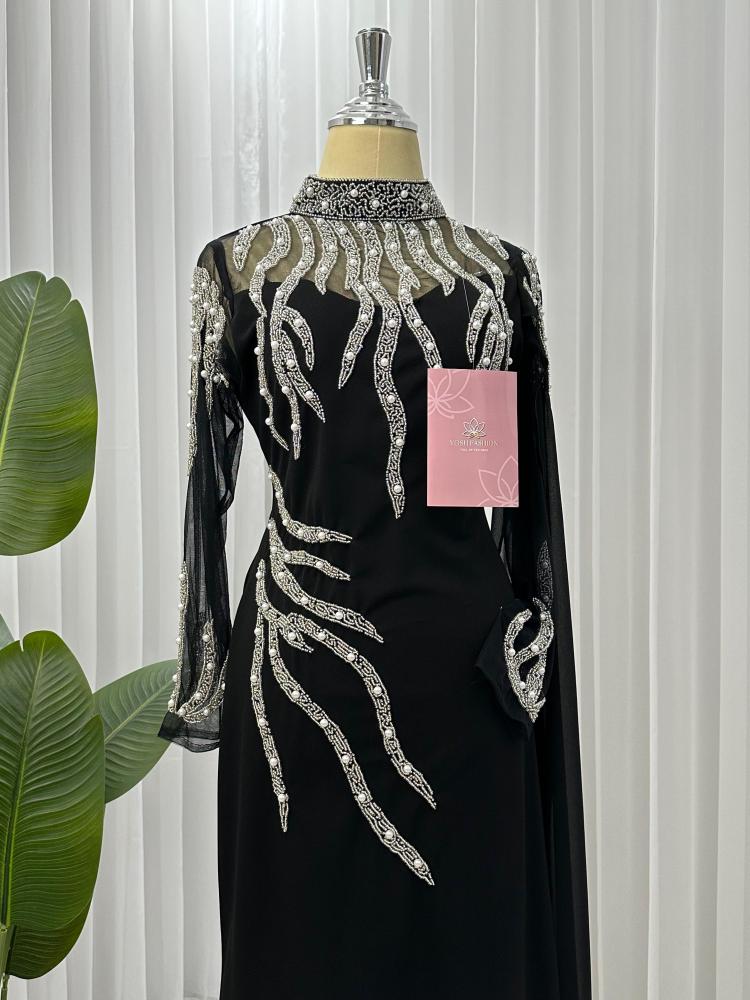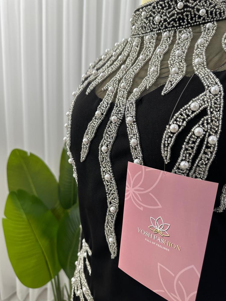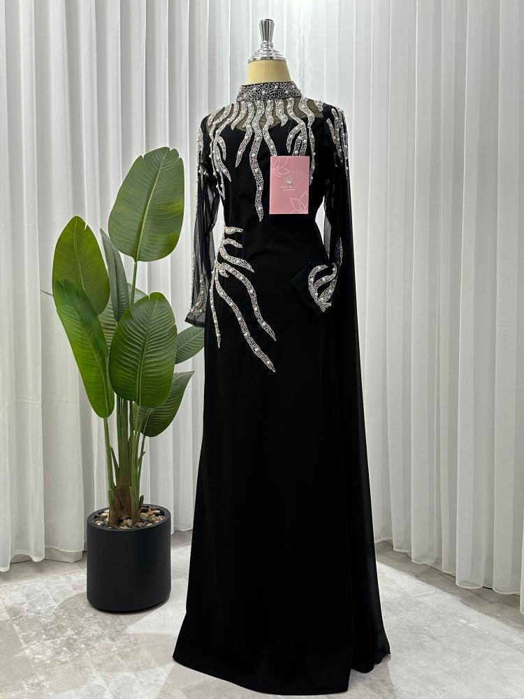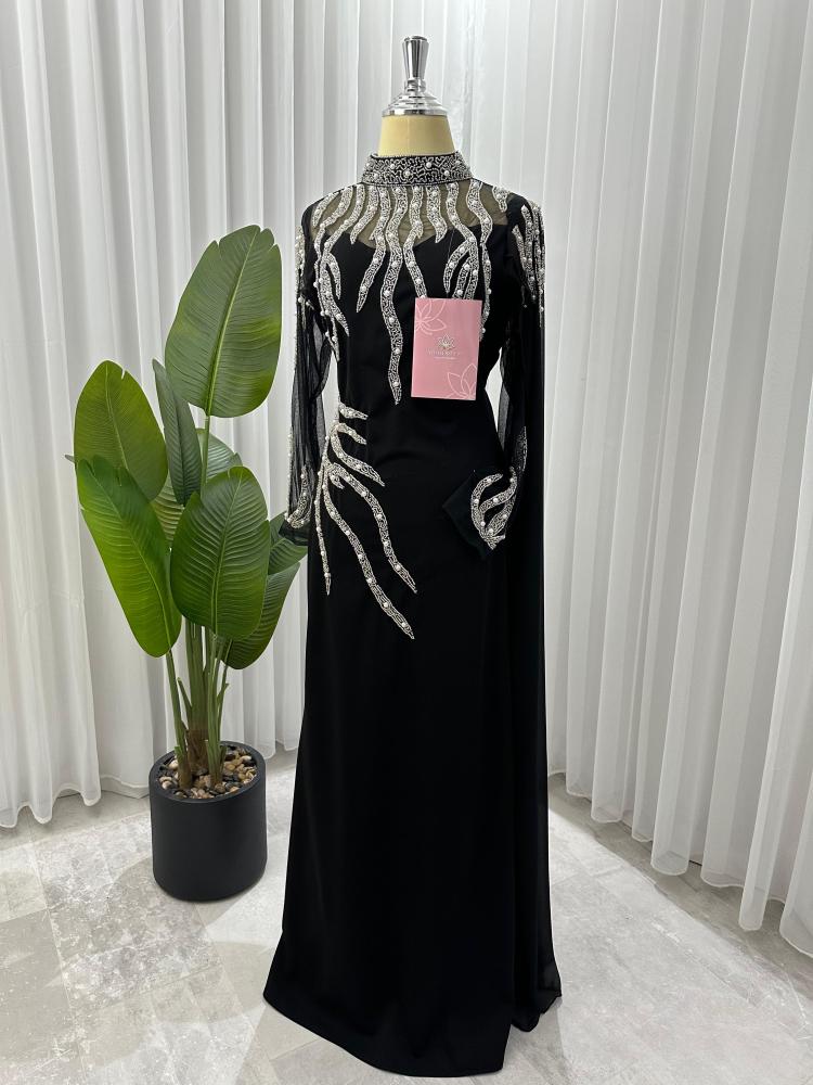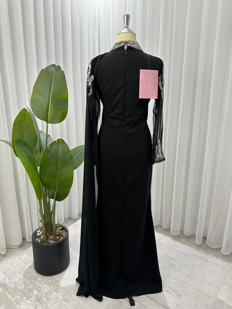 الفستان يتميز بتصميم انيق و فاخر, الفستان ( اسود ) اللون و تتكون من قطعه واحده ، مزينة ب تطريز يتوزع على اليد و و الفستان كامل مما يضيف عليه لمسه فاخرة و مميزة