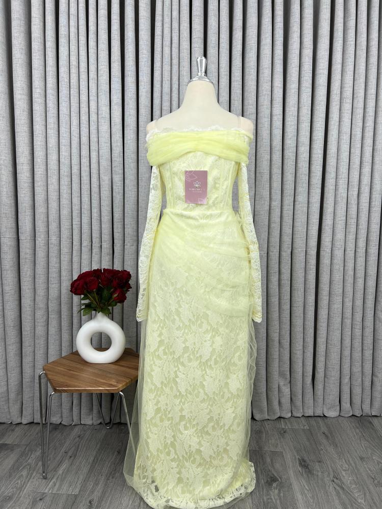 فستان سهرة بلون أصفر ناعم، بتصميم أنثوي راقٍ يجمع بين التول والدانتيل بطبقات متدرجة، مزين بتطريزات ذهبية فاخرة تضيف لمسة من الفخامة والجاذبية، مثالي للمناسبات الأنيقة والاحتفالات الخاصة.✨🌸
