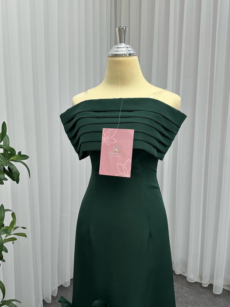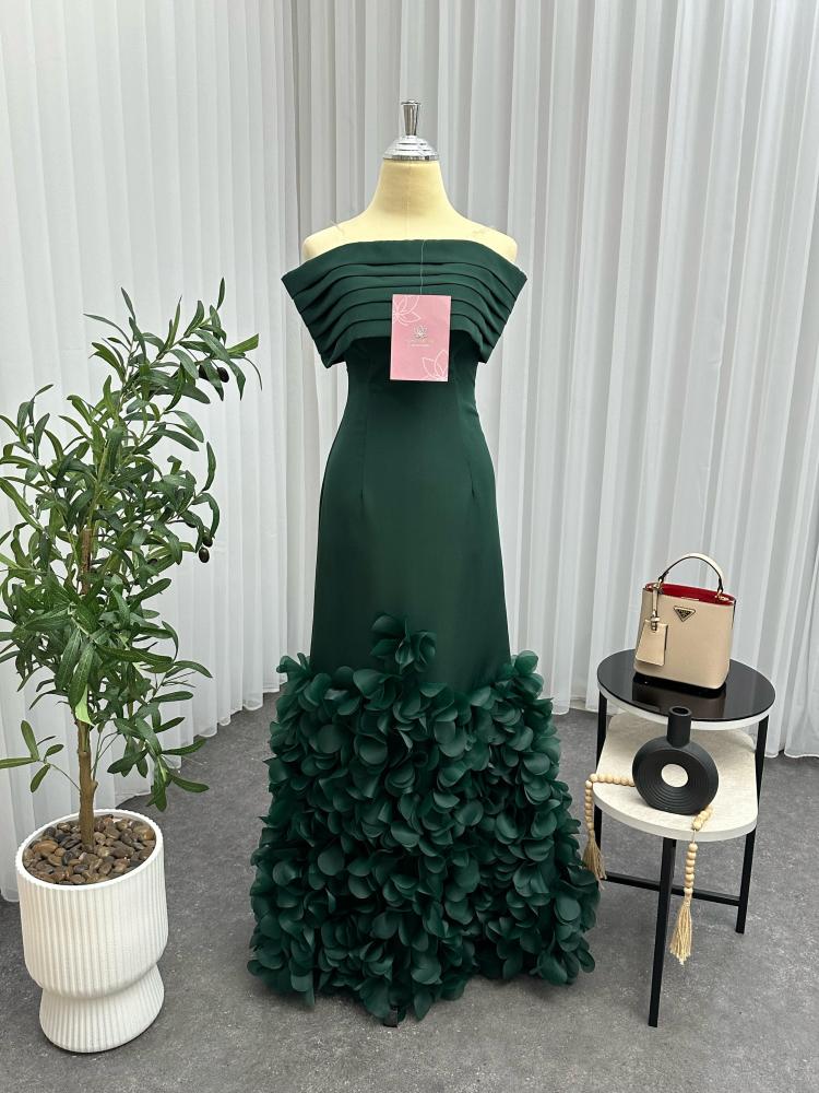 فستان اخضر يتميز ب خصره ورد يدوي و اكمامه و لونه الجميل