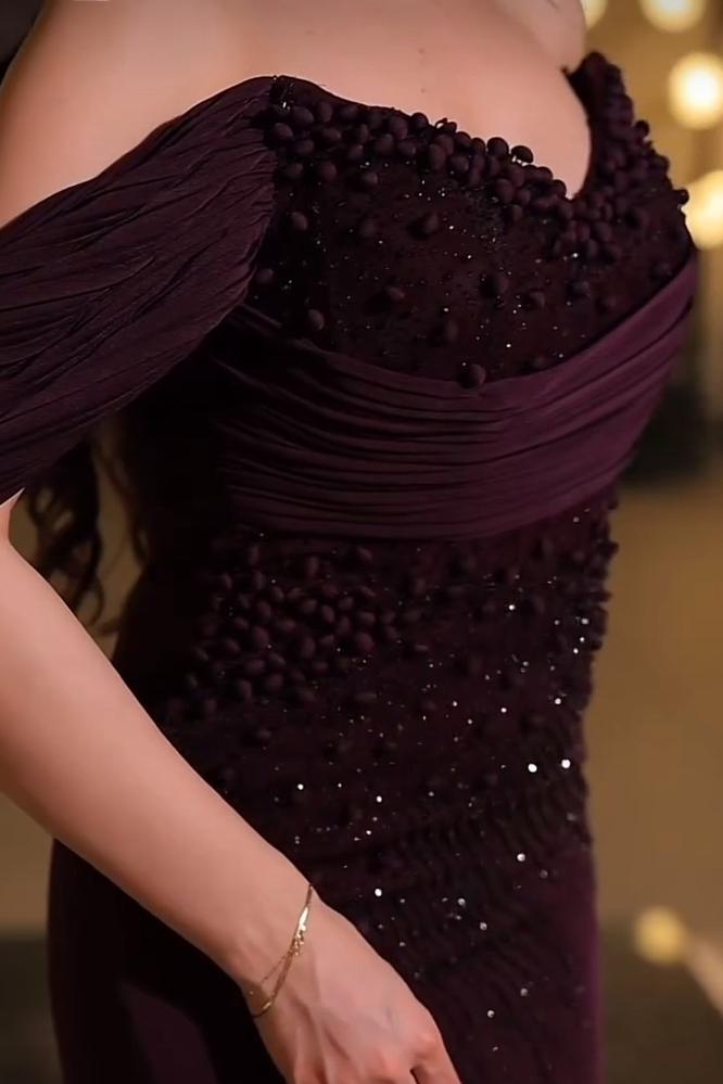فستان سهرة أوف شولدر بلون خمري أنيق، مطرز بتفاصيل لامعة تضيف فخامة، تصميم ضيق يبرز القوام مع ذيل طويل انسيابي مثالي للمناسبات الفاخرة...✨🌸