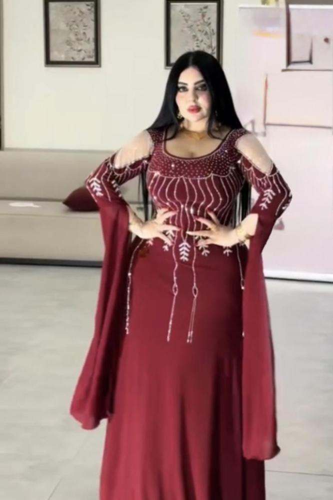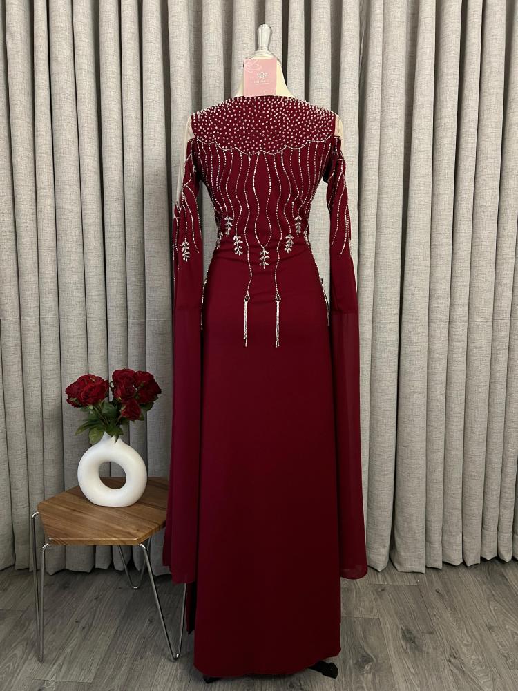 فستان سهرة بنفسجي ضيق بدون أكمام مزين بخطوط لامعة متناسقة تضفي مظهرًا أنيقًا وجذابًا.✨🌸