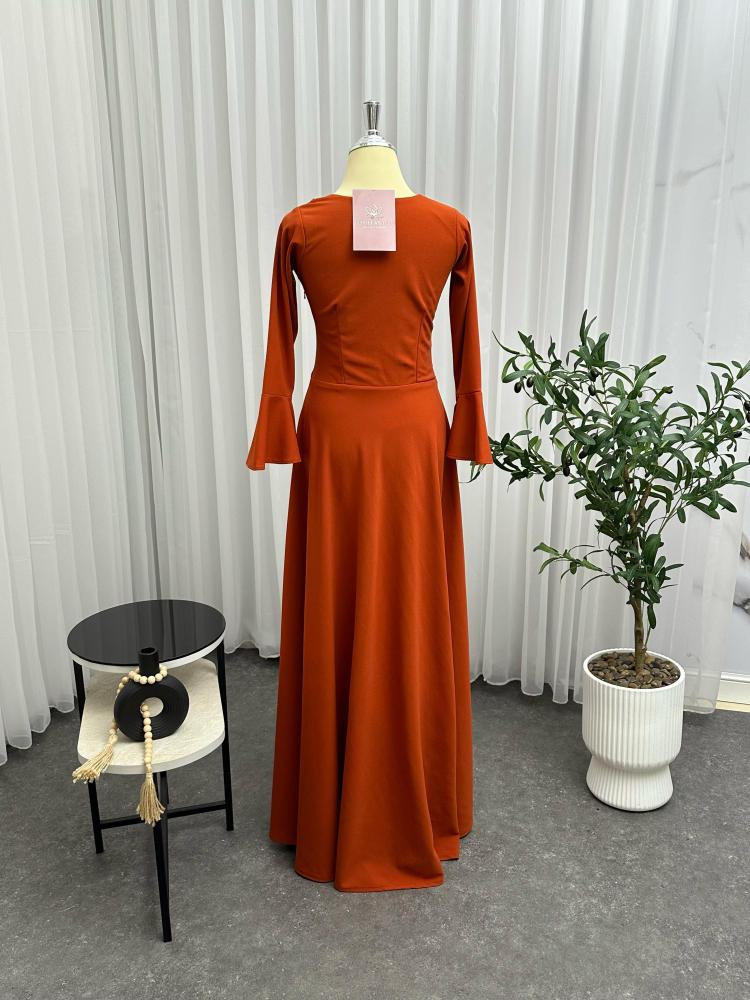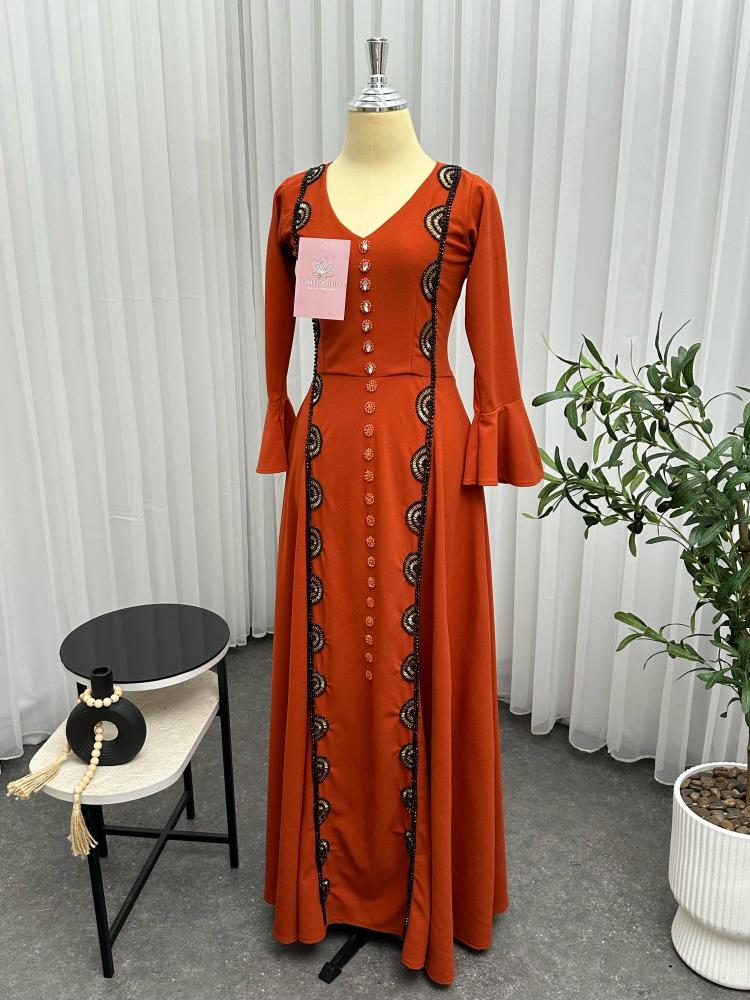 فستان برتقالي مطرز بالصدر يتميز ب خصره الانيق و اكمامه و لونه الاورنجي الجميل