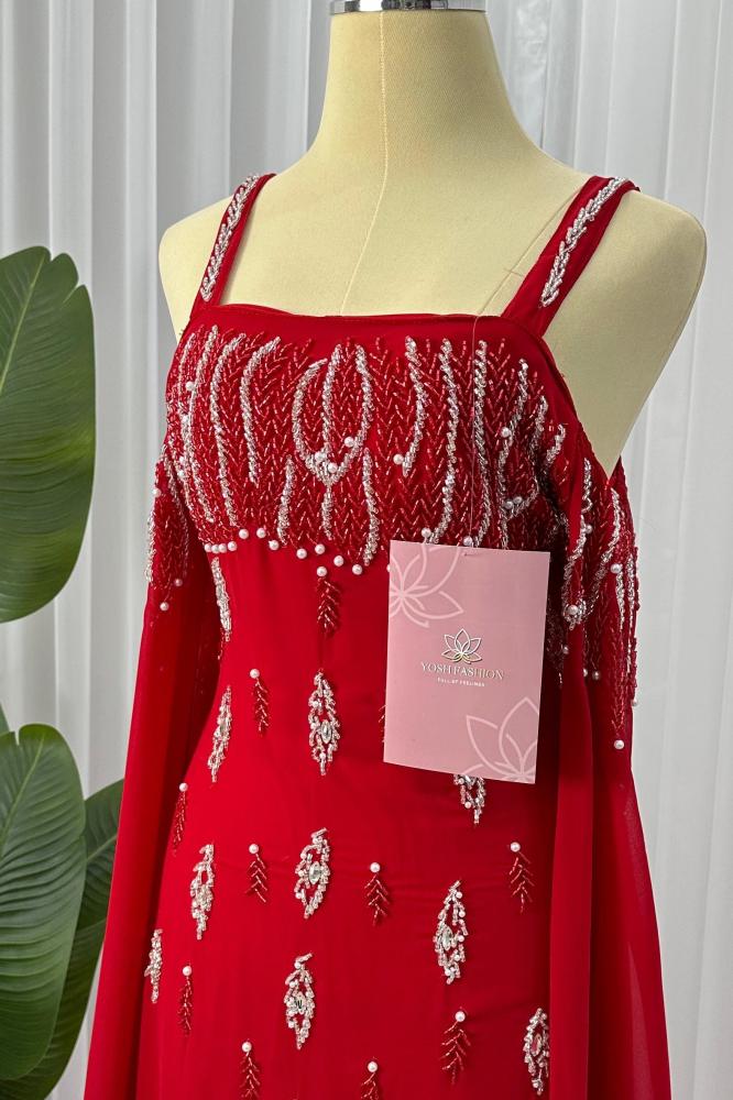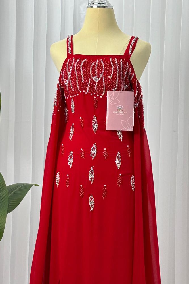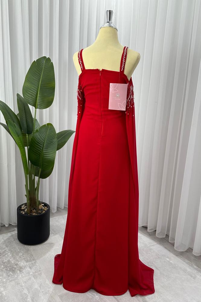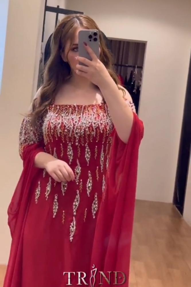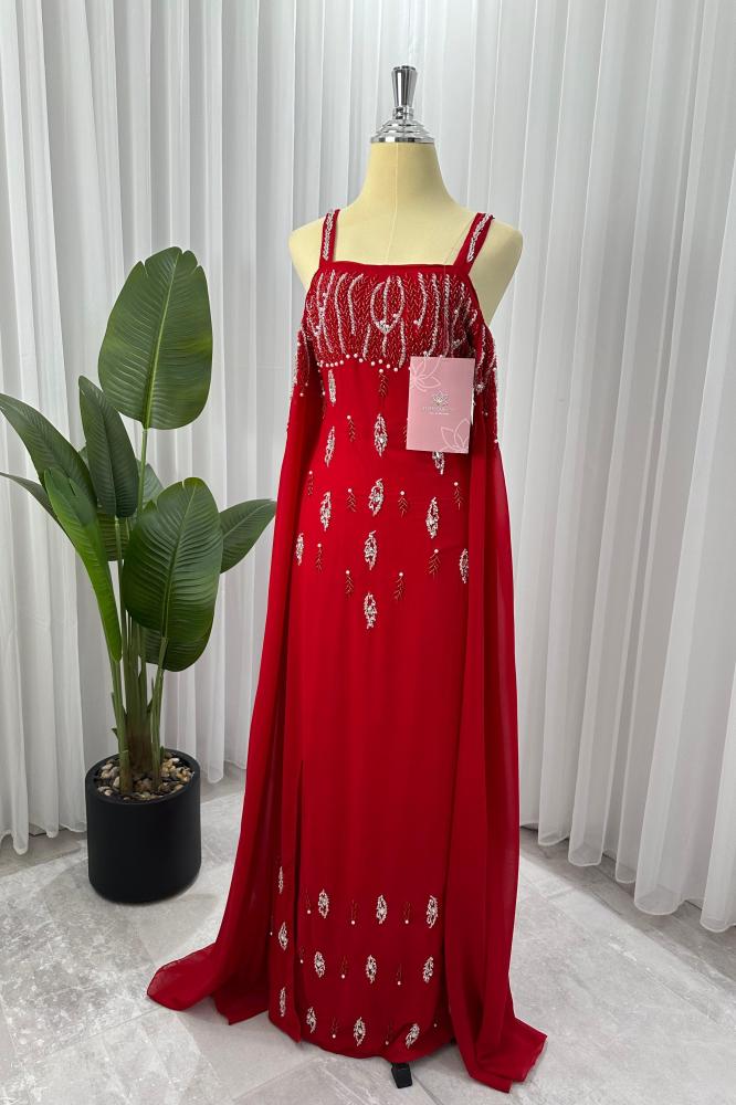 فستان احمر مطرز بالصدر يتميز ب خصره الانيق و اكمامه و لونه الاحمر الجميل