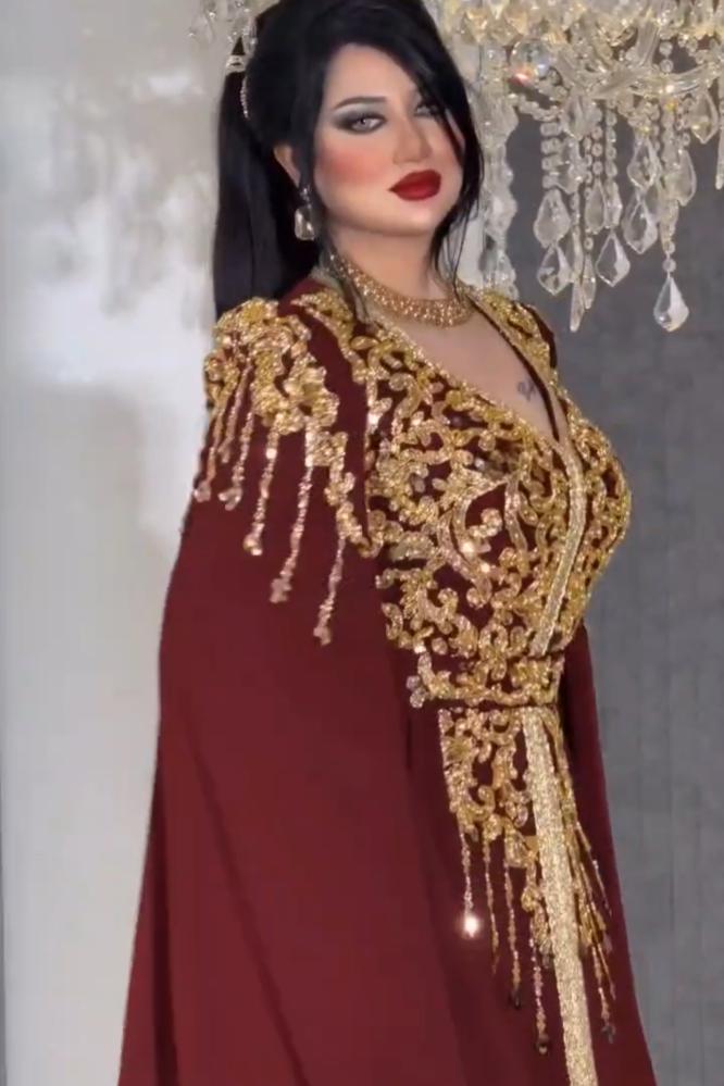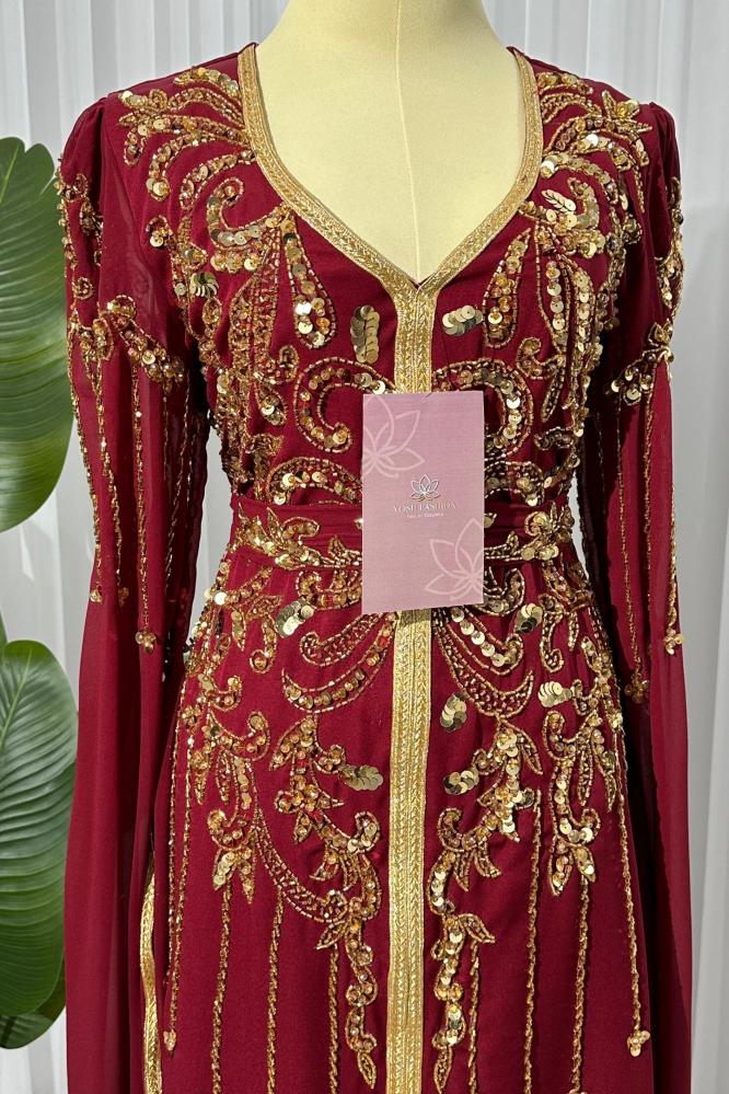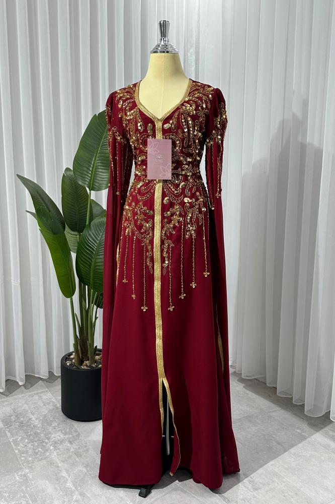 الجلابية تتميز بتصميم انيق و فاخر, الجلابية عودي اللون و تتكون من أكمام طويله مطرزة ، مزينة ب تطريز يدوي كامل التطريز يتوزع على الجلابية كامله مما يضيف عليها لمسه فاخرة و مميزة