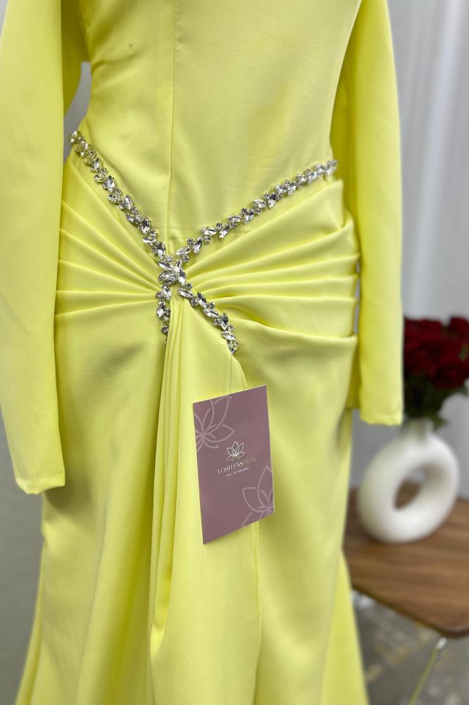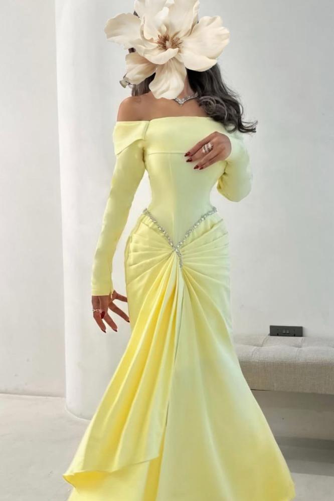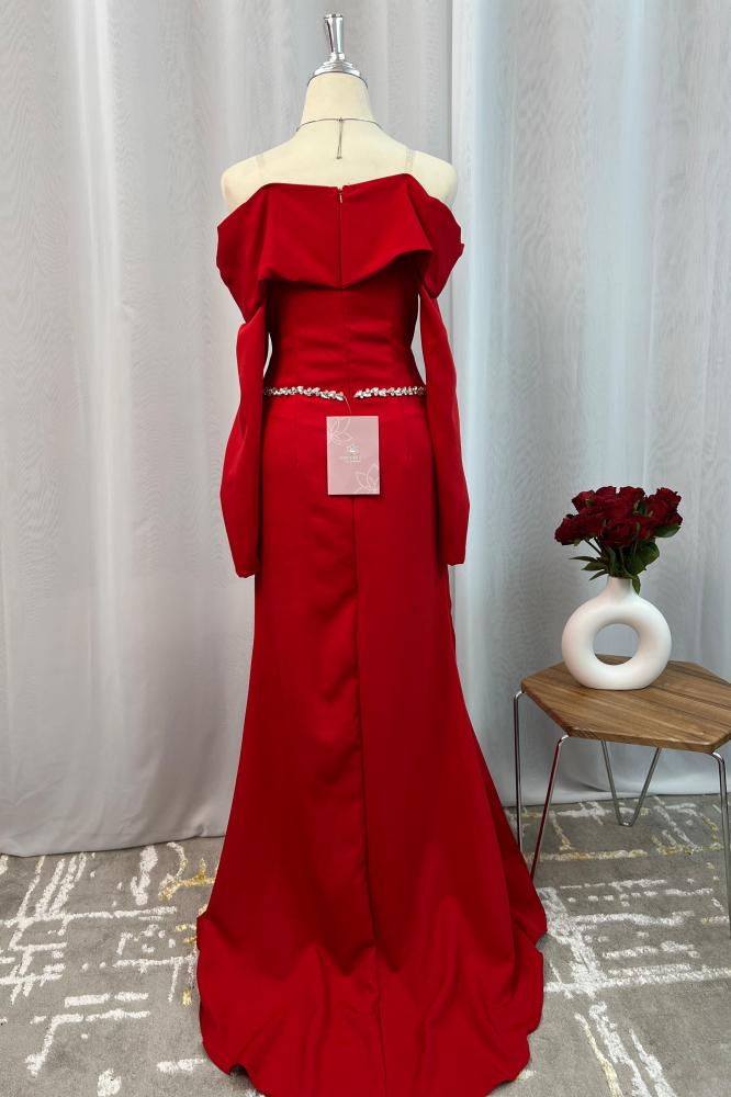 فستان سواريه طويل متوفر بلونين أصفر فاتح و أحمر جذاب، بتصميم أوف شولدر مع أكمام طويلة وزينة كريستال لامعة على الخصر لإطلالة راقية وفاخرة.