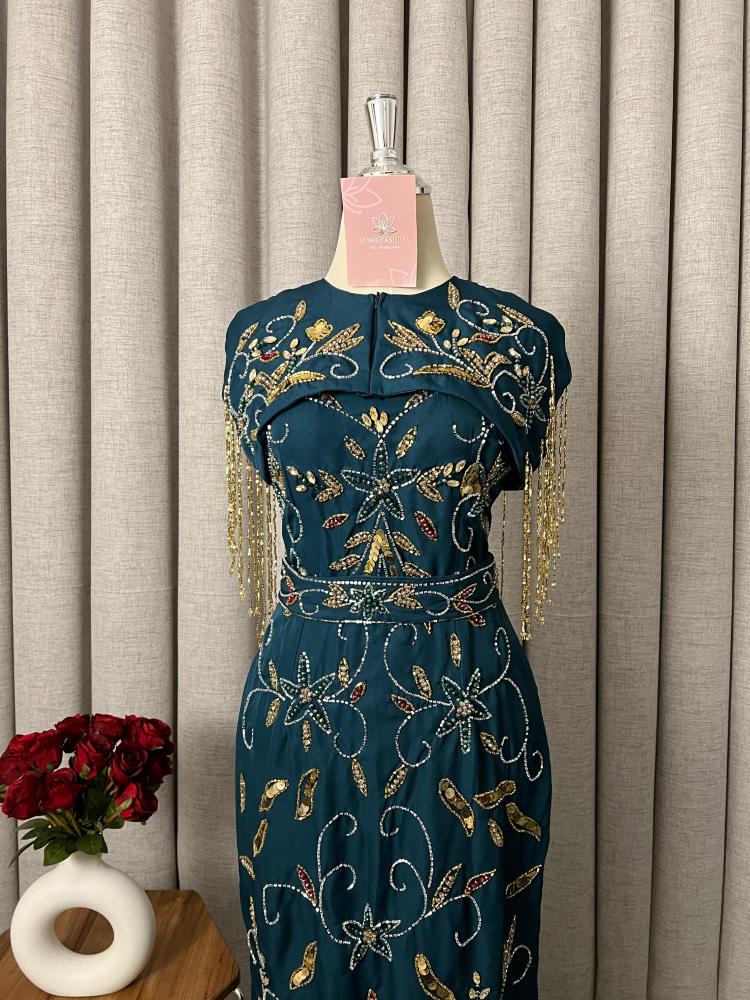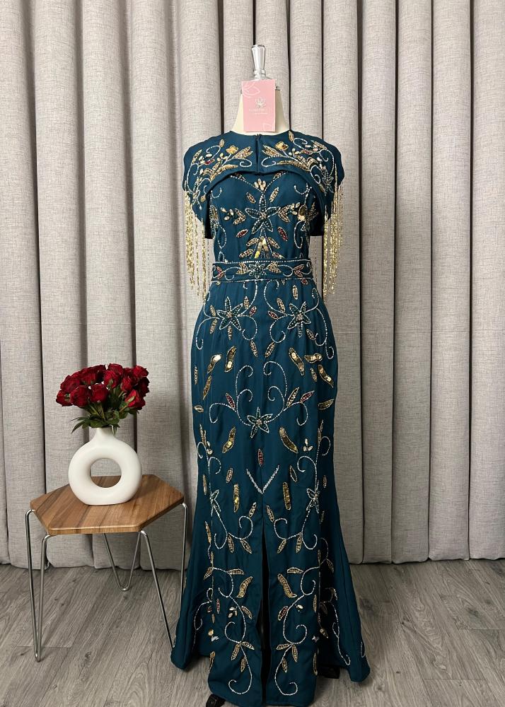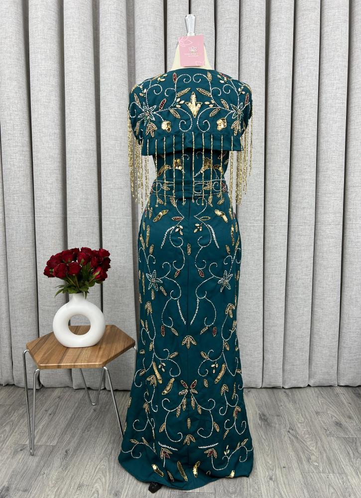 فستان سهرة بلون بترولي فخم، يتميز بتطريزات ذهبية متقنة بتصميم زخرفي فاخر مع خيوط لامعة متدلية على الأكتاف تضيف لمسة فخمة وأنيقة. مثالي للمناسبات الراقية والسهرات التي تتطلب إطلالة ملكية مميزة.✨🌸