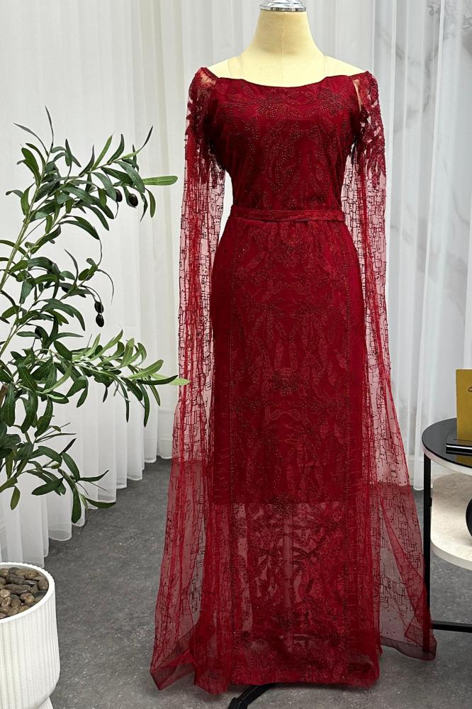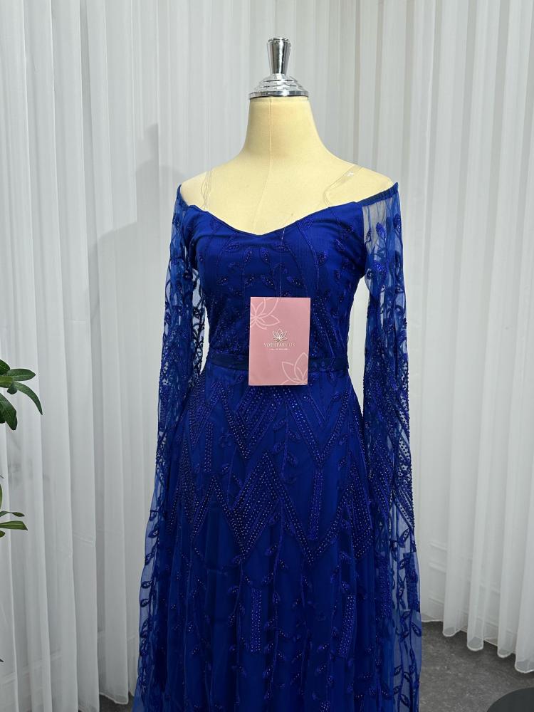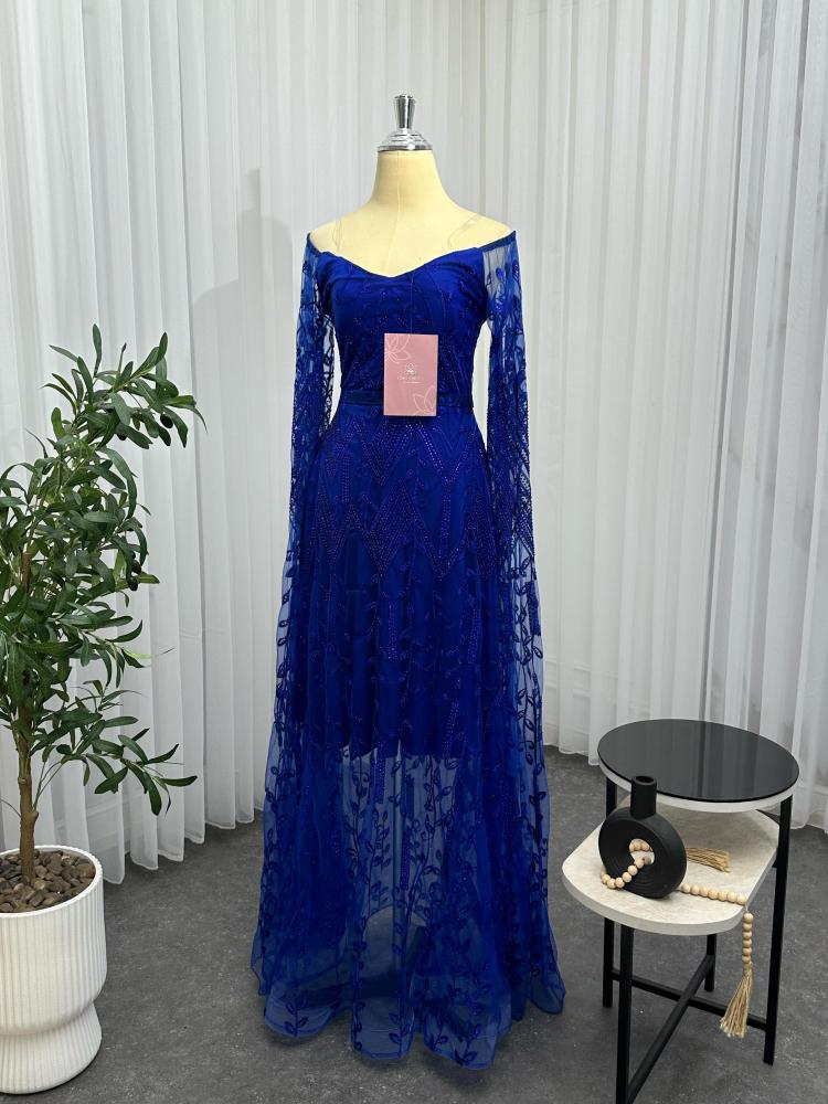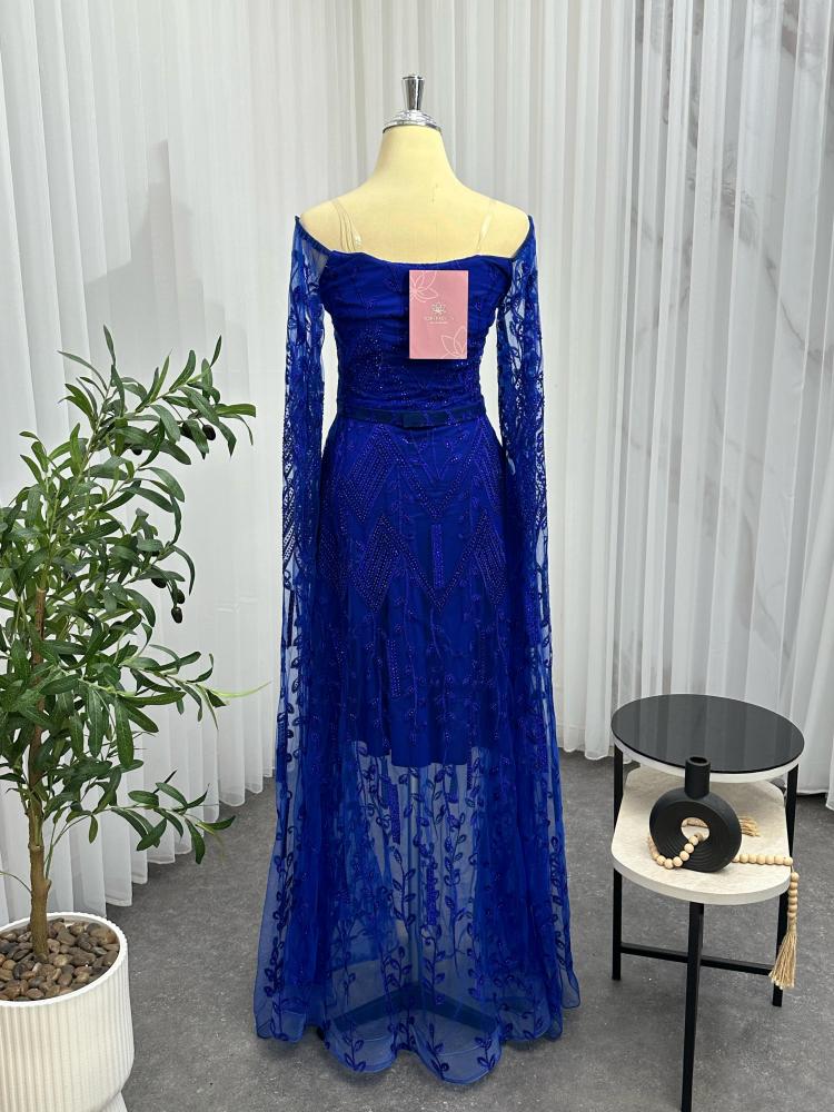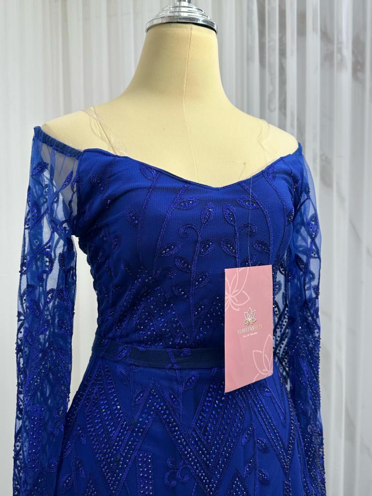 الفستان يتميز بتصميم انيق و فاخر, الفستان ( نيلي عودي ) اللون و تتكون من قطعه واحده ، يتميز ب تطريز كمبيوتر مما يضيف عليه لمسه فاخرة و مميزة