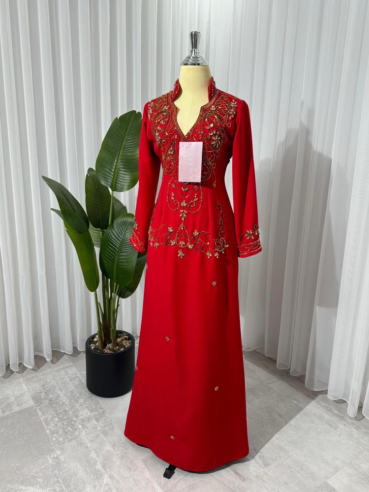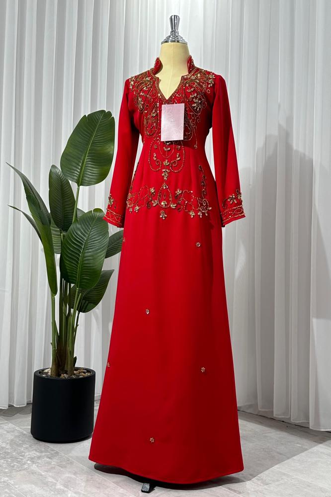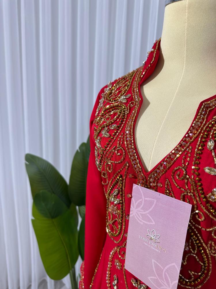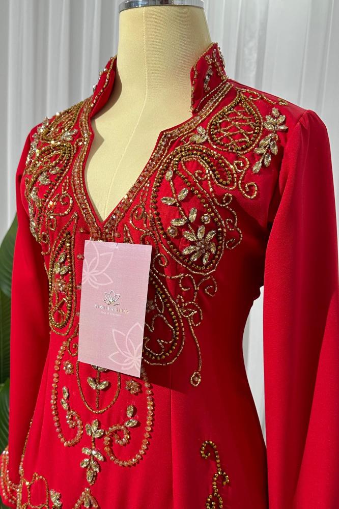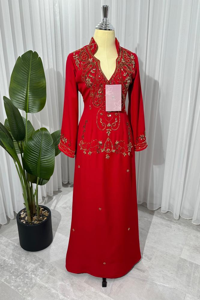 فستان احمر مطرز بالصدر يتميز ب خصره الانيق و اكمامه و لونه الاحمر الجميل